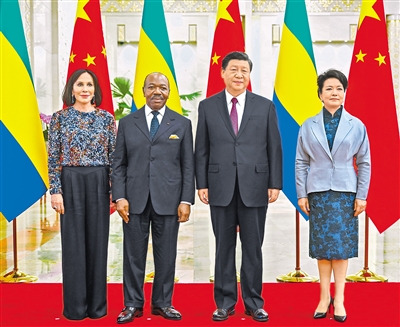 四月十九日下午,國家主席習近平在北京人民大會堂同來華進行國事訪問的加蓬總統邦戈舉行會談。這是會談前,習近平和夫人彭麗媛同邦戈和夫人西爾維婭合影。