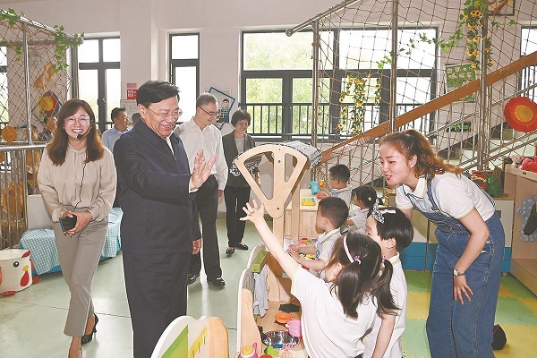 5月31日,省委書記韓俊,省委副書記、省長王清憲在合肥市華山路幼兒園調研,代表省委、省政府向小朋友們致以節日祝賀。本報記者 楊 竹 攝