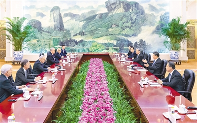 10月9日下午,國家主席習近平在北京人民大會堂會見美國國會參議院多數黨領袖舒默率領的美國國會參議院兩黨代表團。