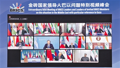 習近平指出,本次峰會是金磚擴員后的首場領導人會晤。當前形勢下,金磚國家就巴以問題發出正義之聲、和平之聲,非常及時、非常必要。加沙地區的沖突已持續一個多月,造成大量平民傷亡和人道主義災難,并出現擴大外溢趨勢,中方深表關切。當務之急,一是沖突各方要立即?;鹬箲穑V挂磺嗅槍ζ矫竦谋┝鸵u擊,釋放被扣押平民,避免更為嚴重的生靈涂炭。二是要保障人道主義救援通道安全暢通,向加沙民眾提供更多人道主義援助,停止強制遷移、斷水斷電斷油等針對加沙民眾的集體懲罰。三是國際社會要拿出實際舉措,防止沖突擴大、影響整個中東地區穩定。各方應該將聯合國大會和安理會有關決議要求落到實處。