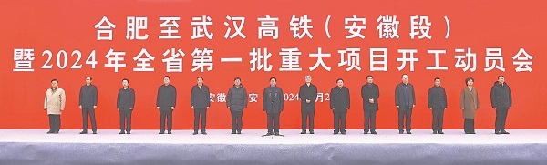1月2日上午,合肥至武漢高鐵(安徽段)暨2024年全省第一批重大項目開工動員會在六安市舉行。省委書記韓俊出席活動并宣布開工。本報記者 楊 竹 攝