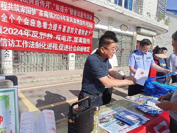 加強協(xié)調聯(lián)動,拓寬基層治理渠道。茶庵鎮(zhèn)積極統(tǒng)籌各方力量參與矛盾隱患排查、糾紛調解等工作,凝聚多元共治合力,提升基層治理水平。依托網格化管理,對鎮(zhèn)域內可能影響社會穩(wěn)定的案件線索以及隱性苗頭開展“拉網式”排查,實現(xiàn)摸排全覆蓋,確保情況清、底數明。對摸排出的矛盾糾紛,第一時間由網格員、“兩代表一委員”“五老”(退休老干部、老黨員、老教師、老法律工作者、老退伍軍人)先行組織調解,調解不成由包村干部聯(lián)系鎮(zhèn)司法所、派出所、綜治中心等部門,整合工作力量,依法依規(guī)開展案件化解工作,將矛盾化解在早、化解在小、化解在萌芽狀態(tài)。2023年以來,共排查矛盾隱患107件,已化解104件。組建法治宣傳隊8支,開展《信訪工作條例》進村活動16次,制作發(fā)放相關宣傳冊3200余份。