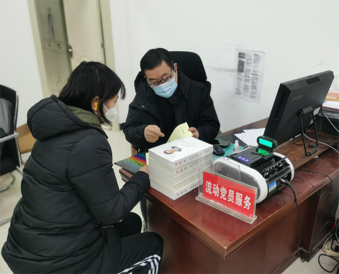 (流動(dòng)黨員服務(wù)窗口工作人員為流動(dòng)黨員發(fā)放學(xué)習(xí)書籍、宣傳就業(yè)幫扶政策)